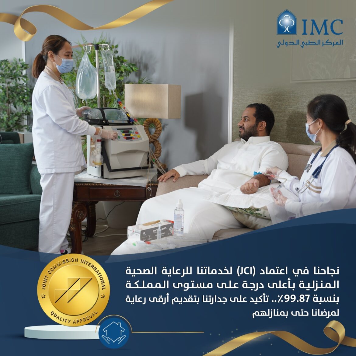 ويمثل الحصول على اعتماد الهيئة الدولية المشتركة (JCI) لخدمات للرعاية الصحية المنزلية شهادة جديدة لخبرة وموثوقية (IMC) في توفير الوقت والجهد في حصول المرضى على الرعاية الصحية ولتصل للنخبة من عملاء الـ (VIP) في منازلهم بباقات مميزة وخيارات متنوعة.
