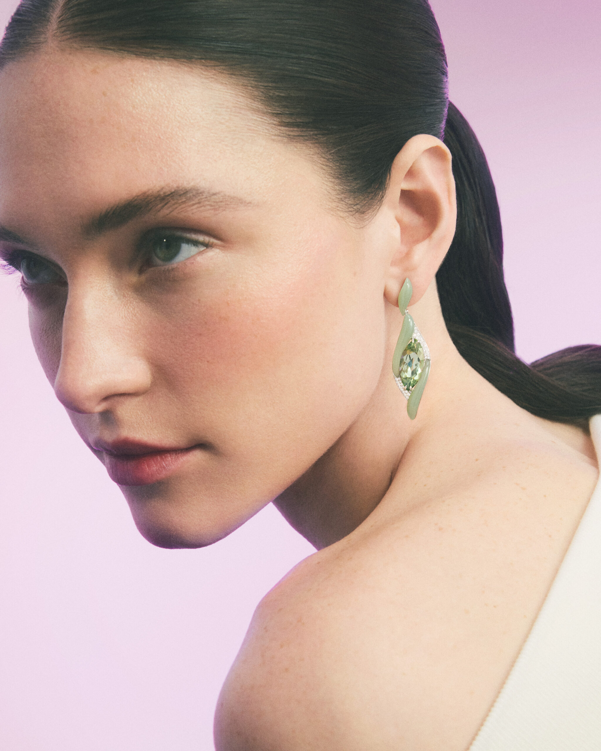 زوج من الأقراط يتوسّطه حبّتان من التورمالين الأخضر بقَطع الماركيز، تحيط بهما منحوتات دقيقة من اليشب (Jadeite) المصاغة على هيئة لهب، تُضفي على التصميم وهجاً داخلياً وإحساساً متحرّكاً بالحياة.