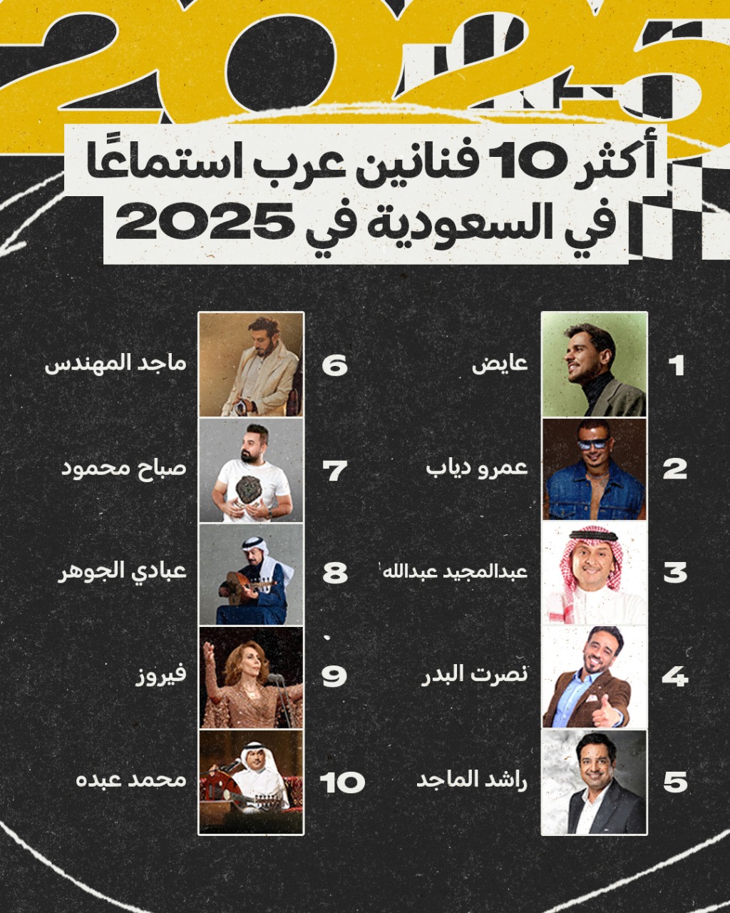 الفنانون العرب الأكثر استماعاً إليهم في السعودية لعام ٢٠٢٥:
