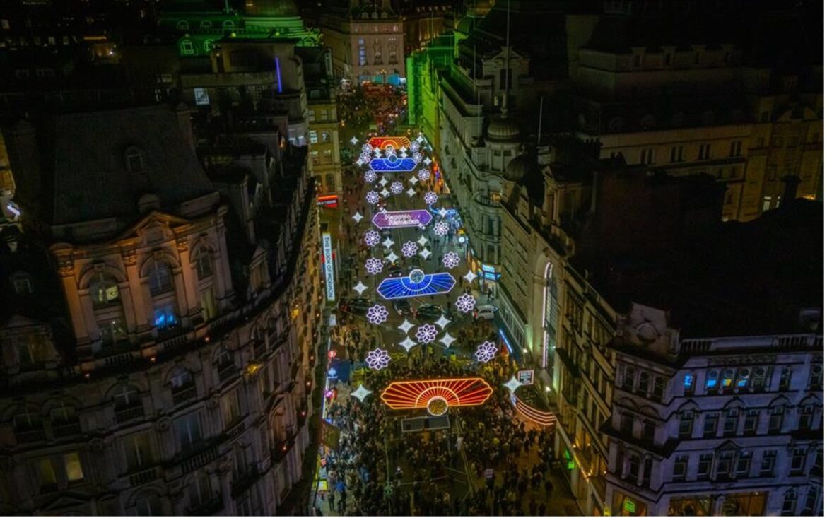 في صميم هذه المبادرة، تتلألأ الإضاءات المُعلّقة على امتداد شارع كوفنتري في لندن، ضمن تركيب فني يضم أكثر من 30 ألف مصباح LED مستدام، صُمّمت في أنماط هندسية دقيقة مستوحاة من الفن الإسلامي، وتتضمن زخارف تجسّد السحور والإفطار.