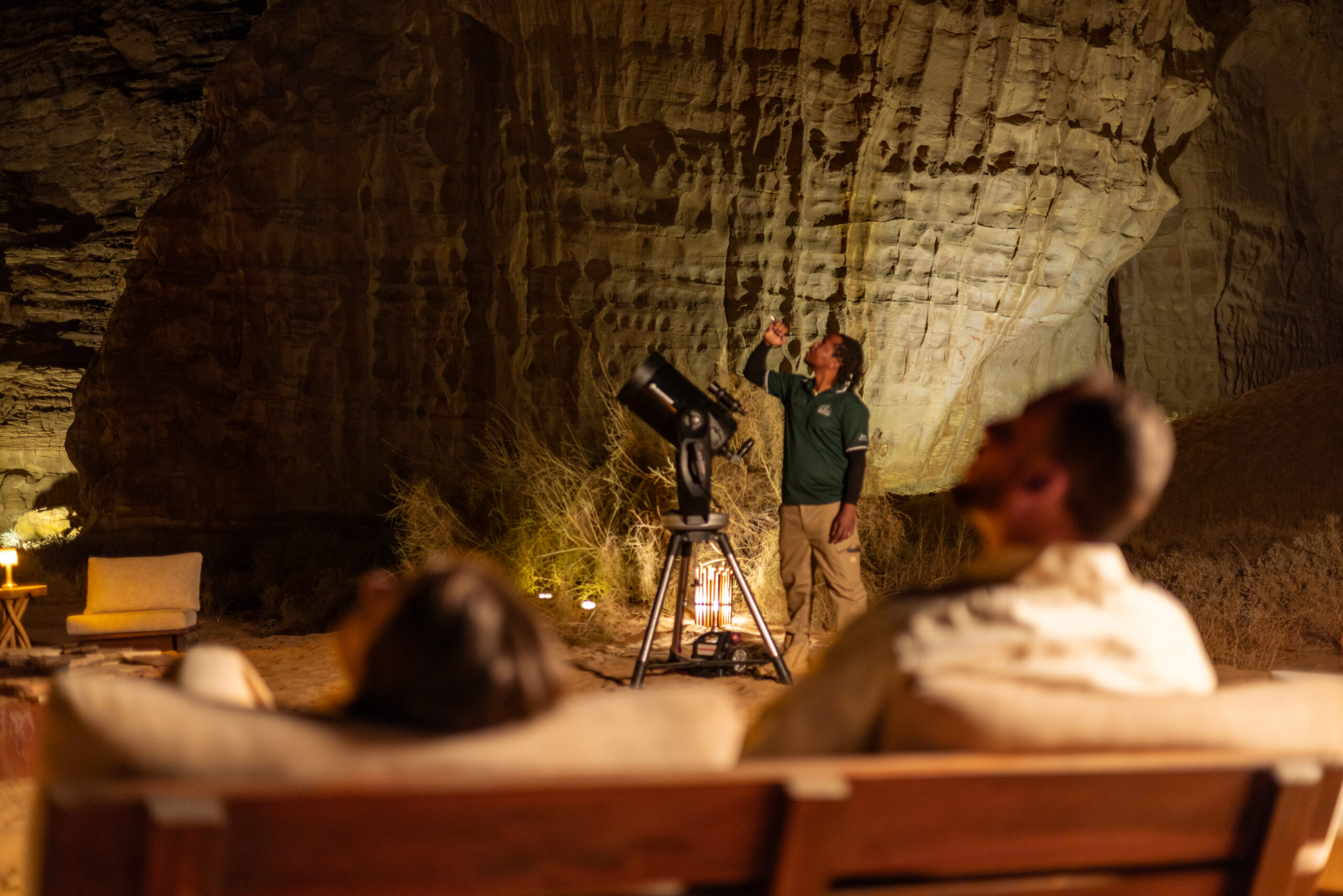 وعند المساء تنتقل الرحلة إلى مخيم منعزل ومتطور مضاء بالفوانيس، حيث تُقدم وجبة العشاء المكونة من أربعة أطباق مستوحاة من مطبخ جنوب أفريقيا، مع اللحوم والخضروات المشوية على النار، واطباق جانبية متنوعة مع حلويات فاخرة تحت السماء المفتوحة. وقبل إنتهاء الأمسية، يحظى الضيوف بتجربة غامرة لمراقبة النجوم حيث تتحول السماء الصحراوية الشاسعة إلى خريطة سماوية يقودها خبراء فلك.