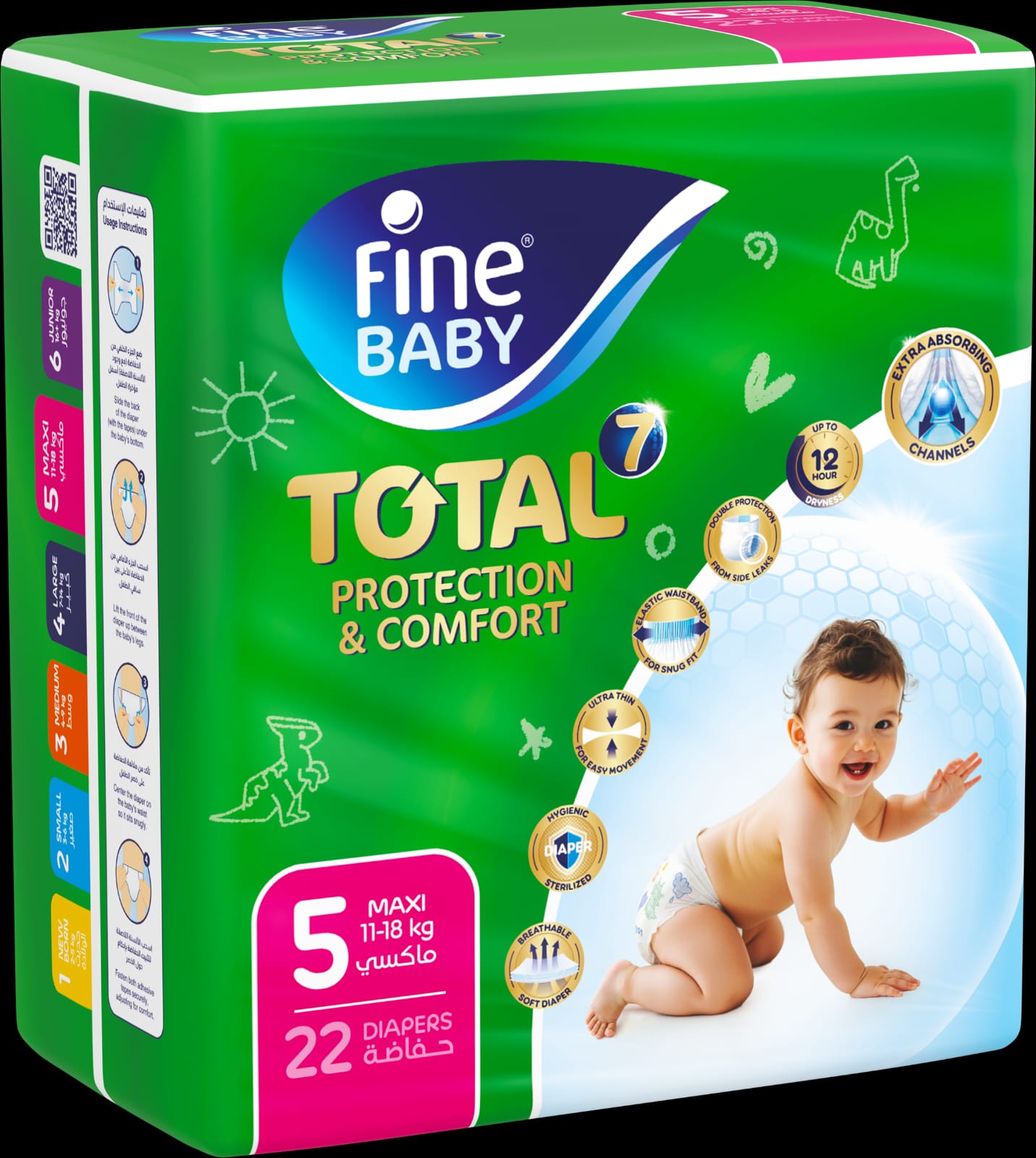 وانطلاقاً من الأساس القوي الذي رسخته حفاضات فاين بيبي الحالية، يأتي هذا الإطلاق الجديد ليقدّم تطوراً واضحاً، لتوفير الحماية والراحة المتكاملة للأطفال. وتتيح حفاضات فاين بيبي® توتال7 (حماية وراحة متكاملة)، العديد من المزايا التي تشمل الحفاظ على الجفاف التام في بشرة الطفل لمدة تصل لغاية 12 ساعة، وتوفير الحماية المزدوجة من التسريب الجانبي، إلى جانب منح البشرة إحساساً بالنعومة الفائقة بفضل ما تحتويه من مواد وبفضل طبقتها الخارجية التي تسمح بمرور الهواء، هذا بالإضافة إلى الثبات المريح مع التصميم المرن والآمن مع الحزام المطاطي الذي يعزز حرية الحركة.