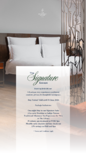 يُقدم الفندق عرض باقة الملاذ الحضري الراقية المصممة لإقامة مريحة، حيث يوفر الفندق أجواءً هادئة بعيداً عن صخب العاصمة. وتشمل هذه الباقة إقامة لليلة واحدة في جناح فاخر مع ترقية مجانية للغرفة حسب التوفر. كما يمكن للضيوف الاستمتاع بإفطار حسب الطلب في مطعم إنديجو تيراس، وجلسة سبا لمدة 30 دقيقة في بيور سبا، إلى جانب مرونة في أوقات تسجيل الوصول والمغادرة، وخصم بنسبة 15٪ على المأكولات والمشروبات وخدمات السبا.