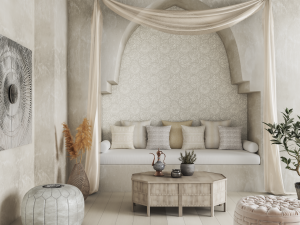 من بين الصيحات الأكثر شعبيةً لهذا الموسم، نذكر الأنماط المغربية التي تطغى على مجموعات رمضان، بدءاً من تصاميم البلاط، مروراً بنمط أوجي وصولاً إلى الأنماط المخرّمة. هذا بالإضافة إلى تفاصيل تقليدية من هذه الصيحة، بما فيها الستائر المتهدّلة الفاخرة، والألوان الزاهية والأشكال النابضة بالحيوية. وعام 2022، تتخذ هذه الصيحات طابعاً أكثر تجرّداً وتنسيقاً. من هذا المنطلق، يوضح سيلو قائلاً: “يشهد هذا الموسم عودة العديد من الأنماط المغربية المونوكرومية إلى تصاميم السجاجيد والوسائد. وتطلّ الأنماط التقليدية التي تحاكي الأجواء المغربية بحلّة متميّزة باللونين الأبيض والأسود، أو بألوان تقليدية بامتياز مثل الزمرّدي والأرجواني الغامق، بلمسة مبسّطة مع تفاصيل أقلّ وتأثيرات أكثر هدوءاً”.
