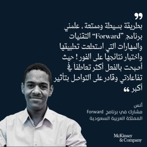 ماكنزي تطلق النسخة الثانية من برنامج التعلّم الافتراضي الريادي لتمكين الشباب “فورورد” في المملكة العربية السعودية والمنطقة – أعلنت ماكنزي آند كومباني اليوم عن فتح باب التسجيل في النسخة الثانية من برنامجها المجاني للتعلم الافتراضي “فورورد” (Forward)، المخصص للمواهب الشابة، حيث سيمكّن البرنامج المشاركين فيه من الشرق الأوسط وباكستان وأفريقيا وتركيا وأذربيجان من الانطلاق في مسار تدريبي نوعي صممه وينفّذه خبراء ماكنزي على مدار 6 أشهر. واستجابةً لتوسع فجوة المهارات التي تواجه العاملين في عالم اليوم، وفيما تفيد دراسات ماكنزي آند كومباني أن حوالي 9 من كل 10 مسؤولين تنفيذيين يرون أو يتوقعون فجوة في المهارات لدى المواهب الشابة في مؤسساتهم وشركاتهم، تم تصميم برنامج “فورورد” لرصد الاحتياجات من مصادرها وتمكين الجيل القادم من المواهب بالمهارات الضرورية الأكثر طلباً في بيئات العمل حاضراً ومستقبلاً، بما في ذلك التكيف والمرونة، وابتكار الحلول، والمهارات الاجتماعية، والذكاء العاطفي، والطرق الجديدة للعمل والتفكير في عالم رقمي متسارع. ويأتي إطلاق النسخة الثانية من “فورورد” بعد النجاح الذي حققته نسخ تجريبية منه في أفريقيا وعملية التسجيل في دورته الأولى في الشرق الأوسط وأفريقيا وتركيا. وسجّل في البرنامج منذ انطلاقه العام الماضي أكثر من 33,000 مهنياً ومهنية من الشباب. وفي المملكة العربية السعودية، سجل في البرنامج أكثر من 2,700 من المواهب الشابة، وشكلت النساء 39% من منتسبيه الذين مثّلوا أكثر من 20 قطاعاً، في حين كان حوالي 30% من المشاركين فيه من رواد الأعمال والمهنيين الشباب العاملين في شركات صغيرة ومتوسطة. وعن مشاركته في الدفعة الأولى من برنامج “فورورد“، قال أنس علي، المتخصص في تقنية المعلومات في المملكة العربية السعودية: “أصبحت أقدر المهارات الشخصية كثيراً في حياتي، فبرنامج “فورورد” عزز إدراكي لمدى التأثير الإنساني العميق لهذه المهارات.” وأضاف: “من خلال أطر وأدوات بسيطة ممتعة، استطعت تطبيق المهارات التي تعلمتها في حياتي اليومية، وأنا الآن أكثر وعياً للأفكار المسبقة وأقدر على التكيّف وتغييرها. كما أصبحت أكثر تعاطفاً في تعاملاتي وتواصلي مع الآخرين.” أما فريحة خيام، المتخصصة في إدارة سلاسل الإمداد في المملكة العربية السعودية فقالت عن تجربتها مع البرنامج العام الماضي: “أوصي الجميع ببرنامج “فورورد” من ماكنزي، لأن محتواه مختار بعناية وهو أساسي لأي مسار أو موقع مهني. كما أن المنهج العملي وطرق التعلم المتنوعة التي يوفرها البرنامج تسهل اكتساب المعرفة وتطبيقها في المسيرة المهنية.” من جهته قال طارق السيد، الشريك الإداري لمكتب ماكنزي في الرياض: “مع التحول الشامل الذي تشهده المملكة العربية السعودية ضمن رؤية المملكة 2030، فإن تعزيز المهارات للمواهب الصاعدة أولوية.” وأضاف: “عبر تطوير قدرات ابتكار الحلول وترسيخ المهارات القيادية لدى الأفراد لتحقيق أفضل النتائج في أوقات التحولات، يمكن للمواهب السعودية الشابة أن تساهم بشكل نوعي في رسم مستقبل التنمية الاقتصادية والاجتماعية بالمملكة.” وإلى جانب المحتوى الرقمي التفاعلي لبرنامج “فورورد” وجلساته التي توظف تقنيات الواقع الافتراضي والغامر ويقدمها الخبراء والمختصون في ماكنزي، يقدم فورورد مساراً من أنشطة تعلّم تقوم على التعاون بين الأقران بهدف منح المشاركين الفرصة لوضع ما تعلّموه موضع التطبيق في بيئة تعاونية آمنة. وبنهاية الأشهر الستة للبرنامج، ينضم المشاركون إلى مجتمع حيوي من خريجي “فورورد” الحريصين على التعلم المستمر والذين يمثلون أكثر من 60 بلداً. وعلى المستوى العملي، تساعد هذه الرحلة المواهب الشابة على تعلّم كيفية: